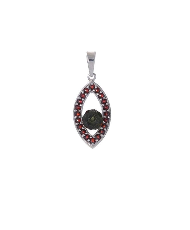 Přívěs ze stříbra 925/1000 osázený českými granáty a vltavínem s povrchovou úpravou rhodiováním.
