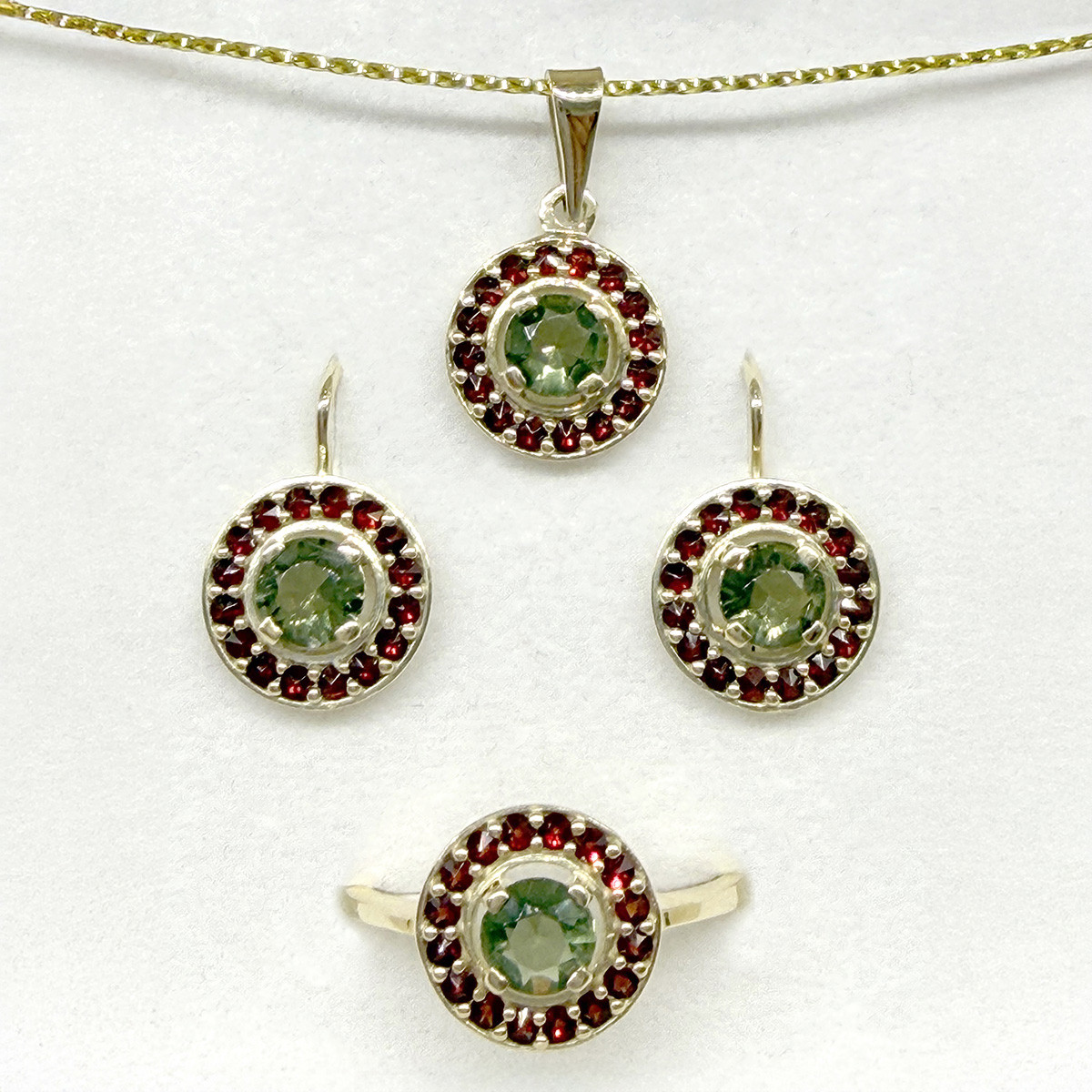Souprava ze zlata 585/1000 osázená českými granáty a vltavíny.