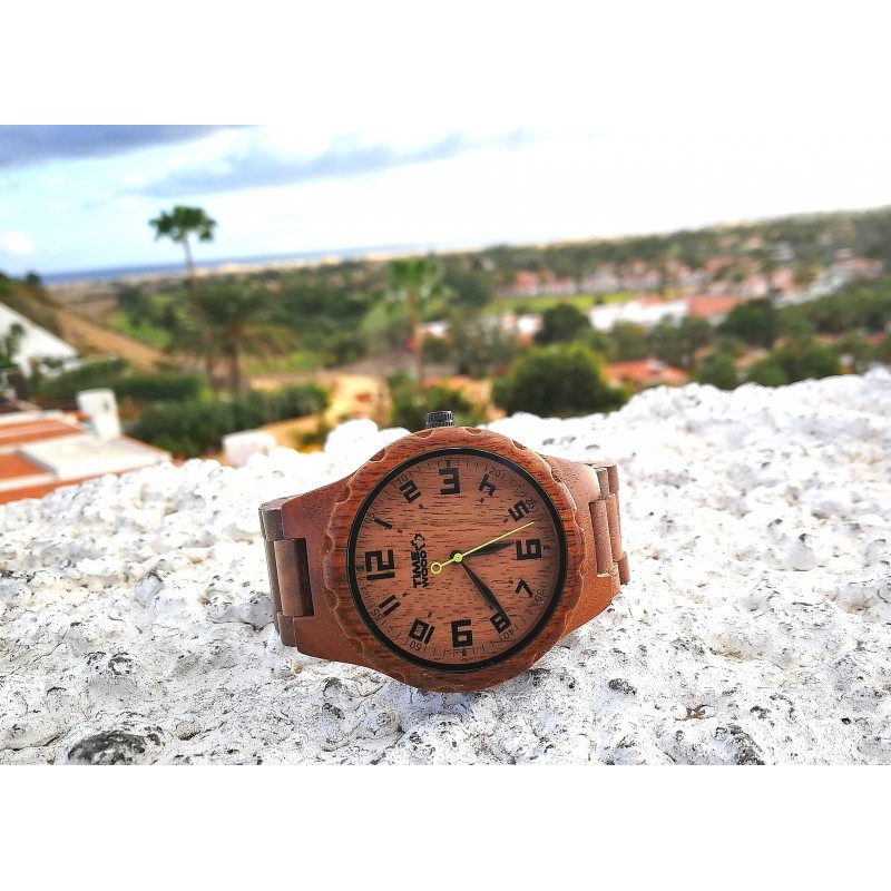 Hodinky jsou vyrobené ze dřeva tmavého ořechu. Jsou originální s výrazně žlutou vteřinovou ručkou a jsou unisex.